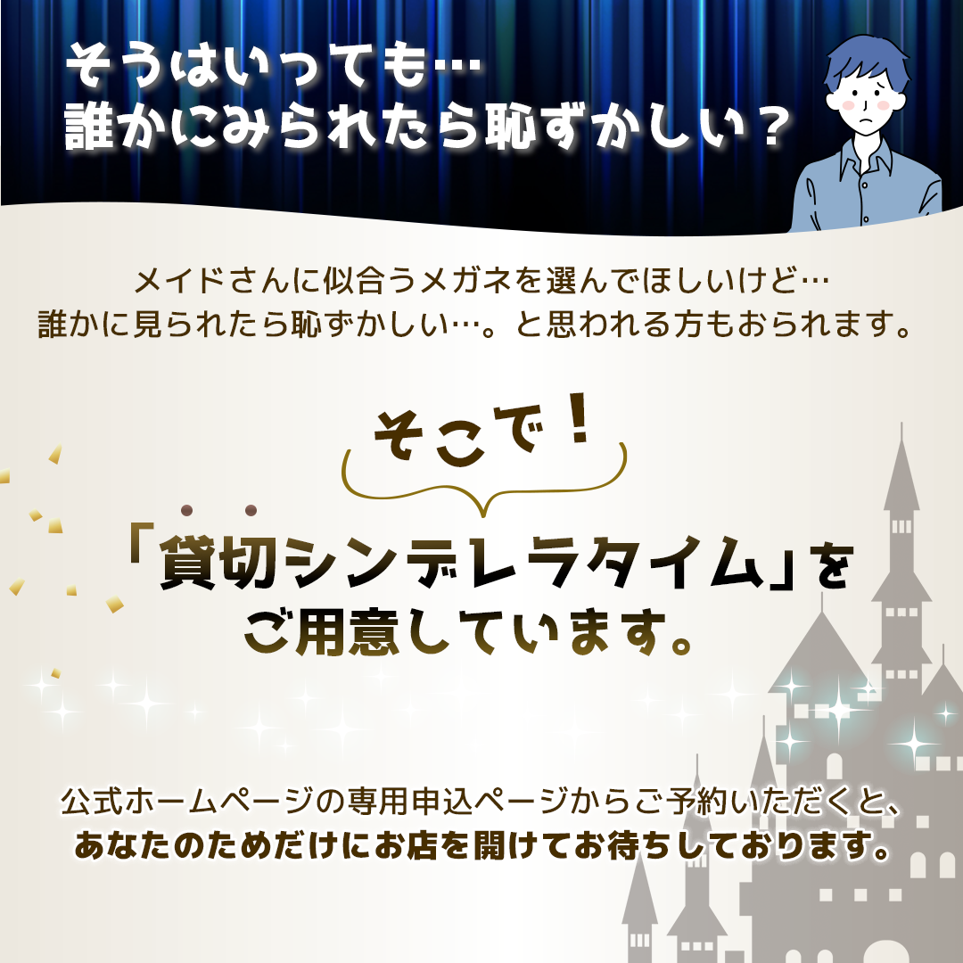 貸切シンデレラタイムは枠数に限りがありますので、当日予約をお受けできないこともあります。